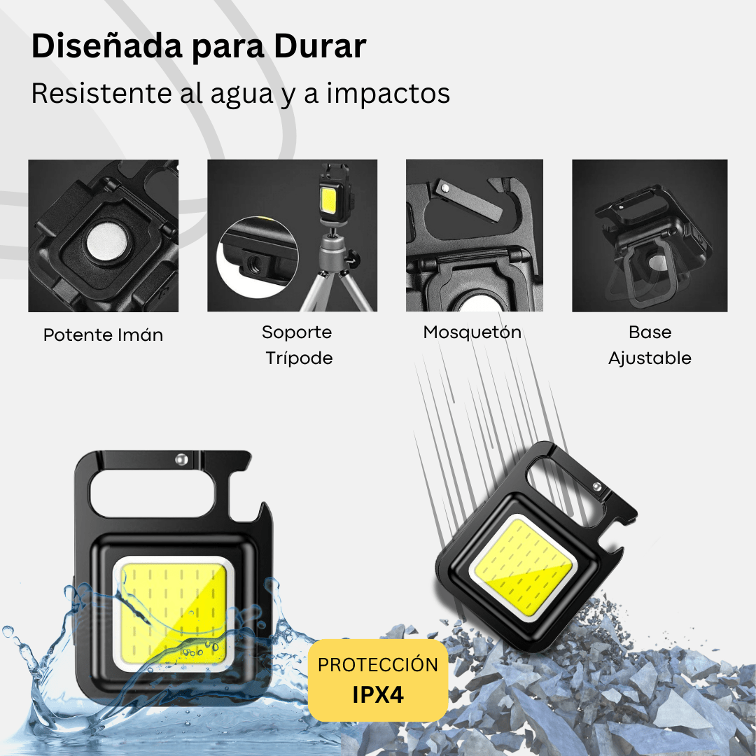Cuenta con base magnética y mosquetón para fijarla en superficies metálicas o colgarla, permitiendo iluminación manos libres y resistente a condiciones duras.
